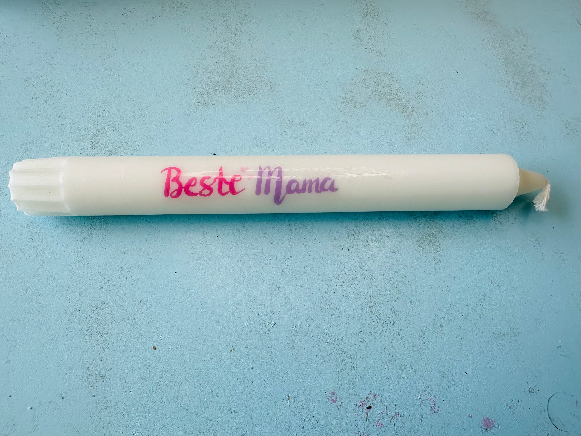 Die Schriftzüge sind handschriftlich von mir entworfen und werden mit einem Laserdrucker auf Wasserschiebefolie und von dort auf die Kerze aufgebracht und mit einem Kerzenlack versiegelt.
