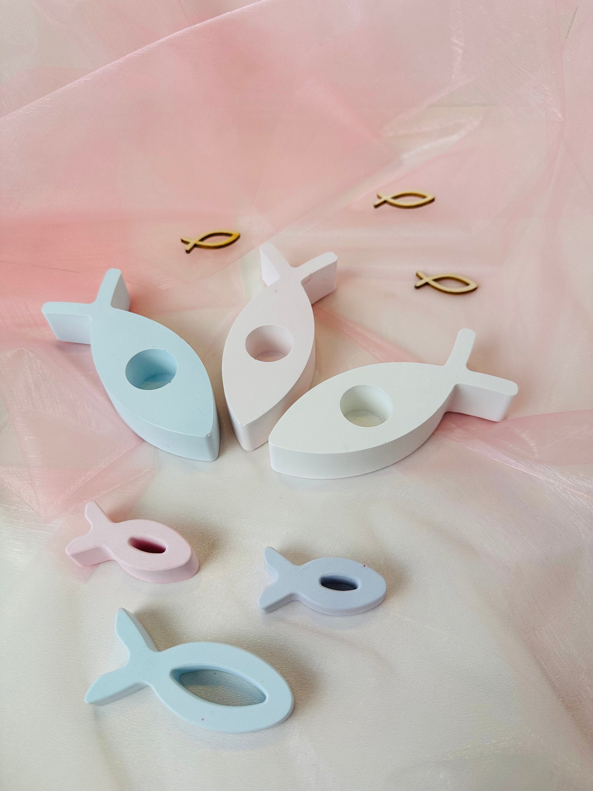 Es handelt sich hierbei um Kerzenhalter in Fischform für Stabkerzen.