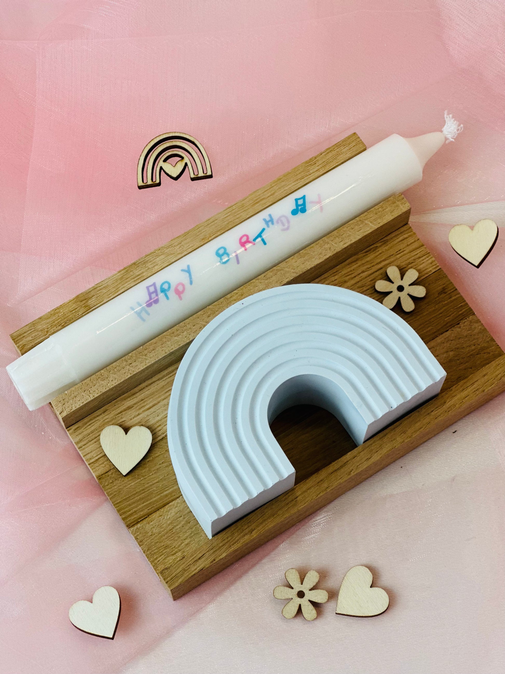 Zum Verschenken eignen sich insbesondere Sets mit Kerzen. Dieses Set ist zum Geburtstag mit einer Geburtstagskerze und einem Regenbogen-Kerzenhalter.