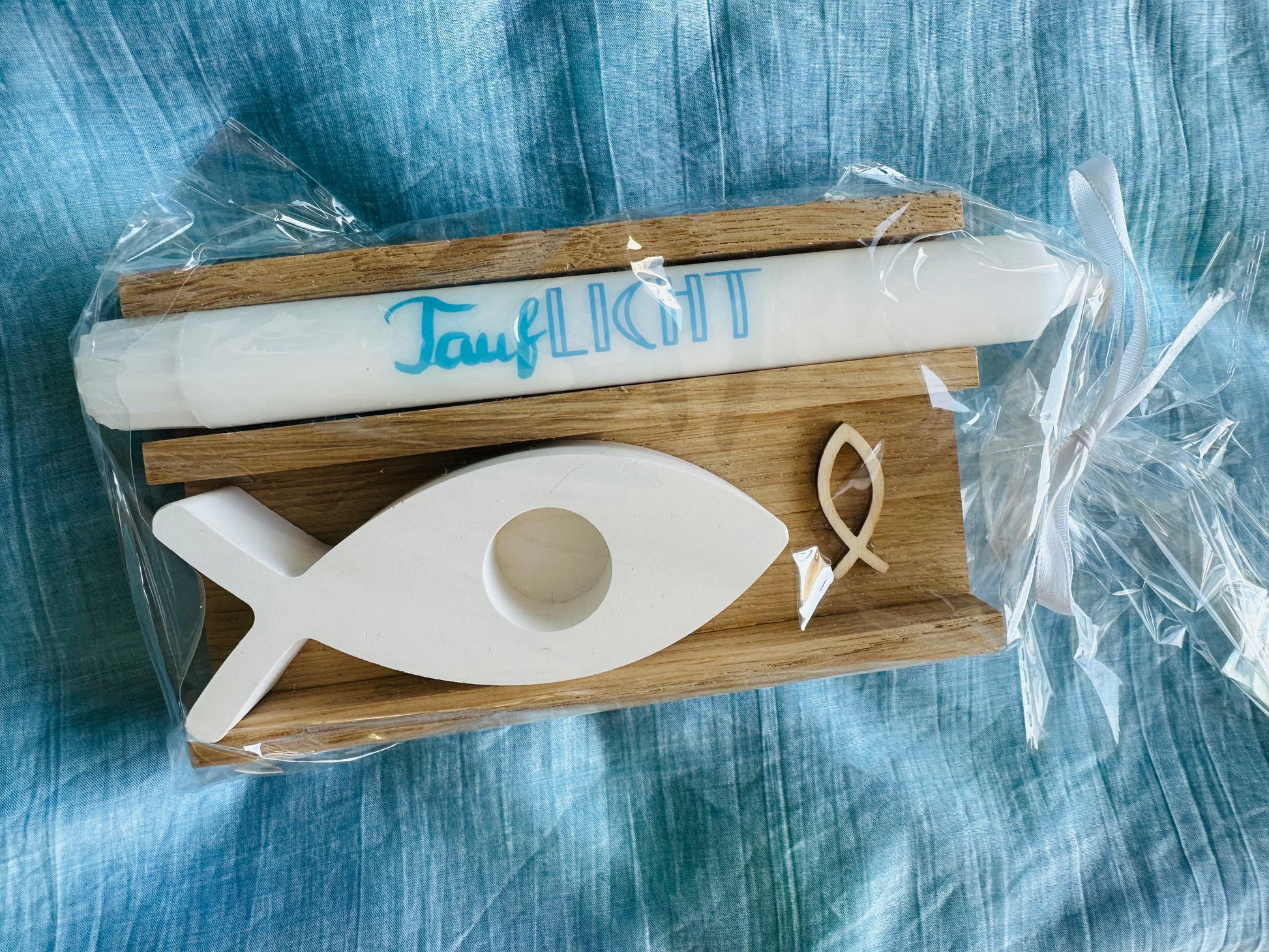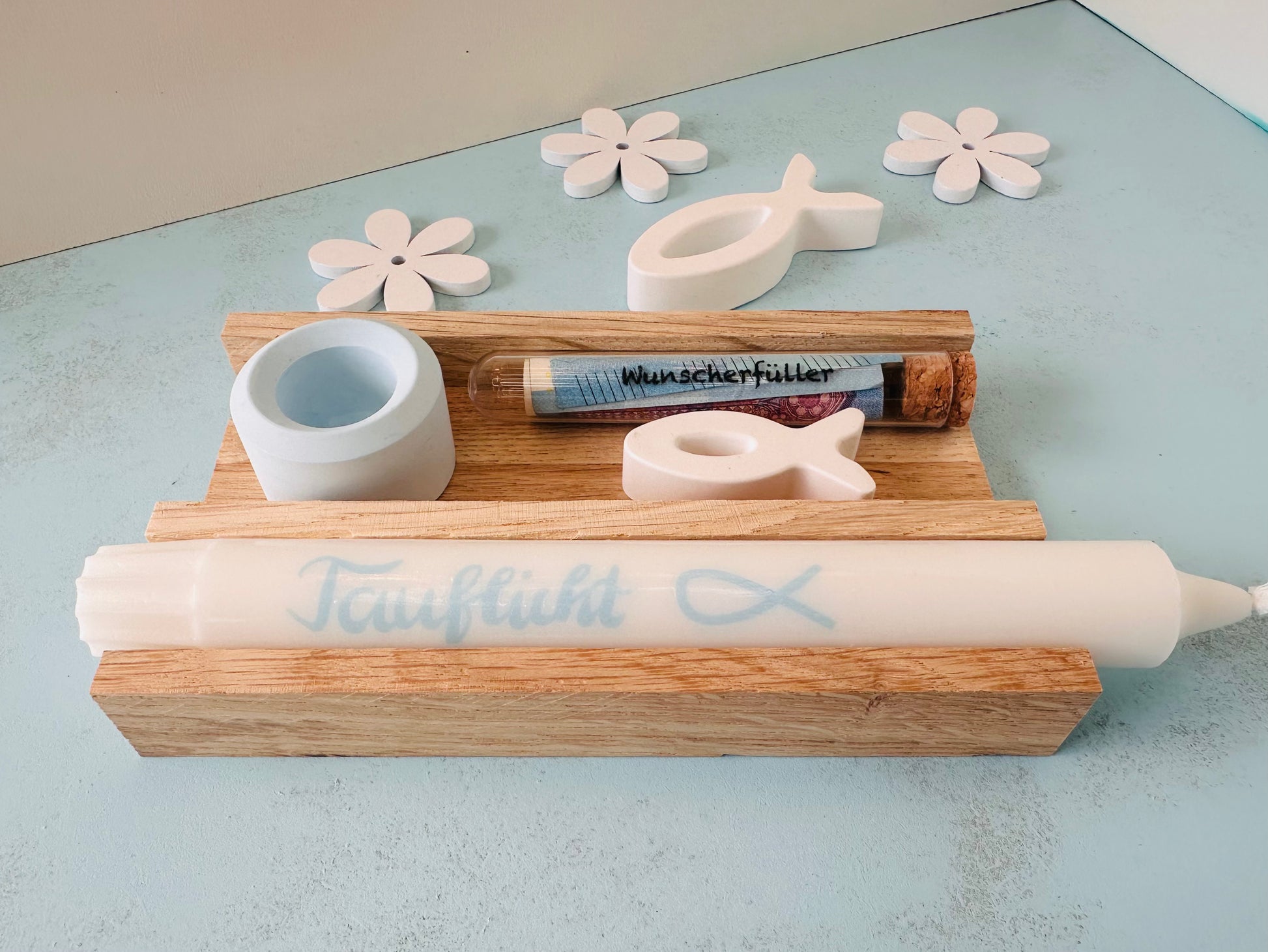 Zum Verschenken eignen sich insbesondere Sets mit Kerzen. Dies ist ein Set zur Taufe mit einer passenden Kerze, einem Kerzenhalter und einem Behälter für Geld - das Geld ist in dem Set nicht enthalten wie auch die umliegende Deko.