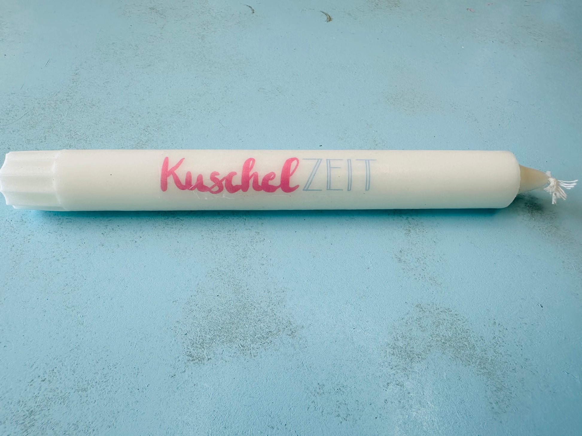 Die Schriftzüge sind handschriftlich von mir entworfen und werden mit einem Laserdrucker auf Wasserschiebefolie und von dort auf die Kerze aufgebracht und mit einem Kerzenlack versiegelt.